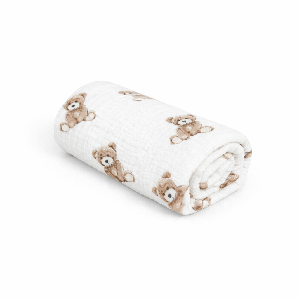 Unsere kuschelweiche Musselin-Decke mit Teddybär-Muster ist der ideale Begleiter für dein Baby – ob als Schmusetuch, Puckdecke, leichte Zudecke, Kinderwagendecke oder Stilltuch. Das hochwertige Mulltuch schenkt Geborgenheit, Sicherheit und Wohlbefinden – immer und überall.