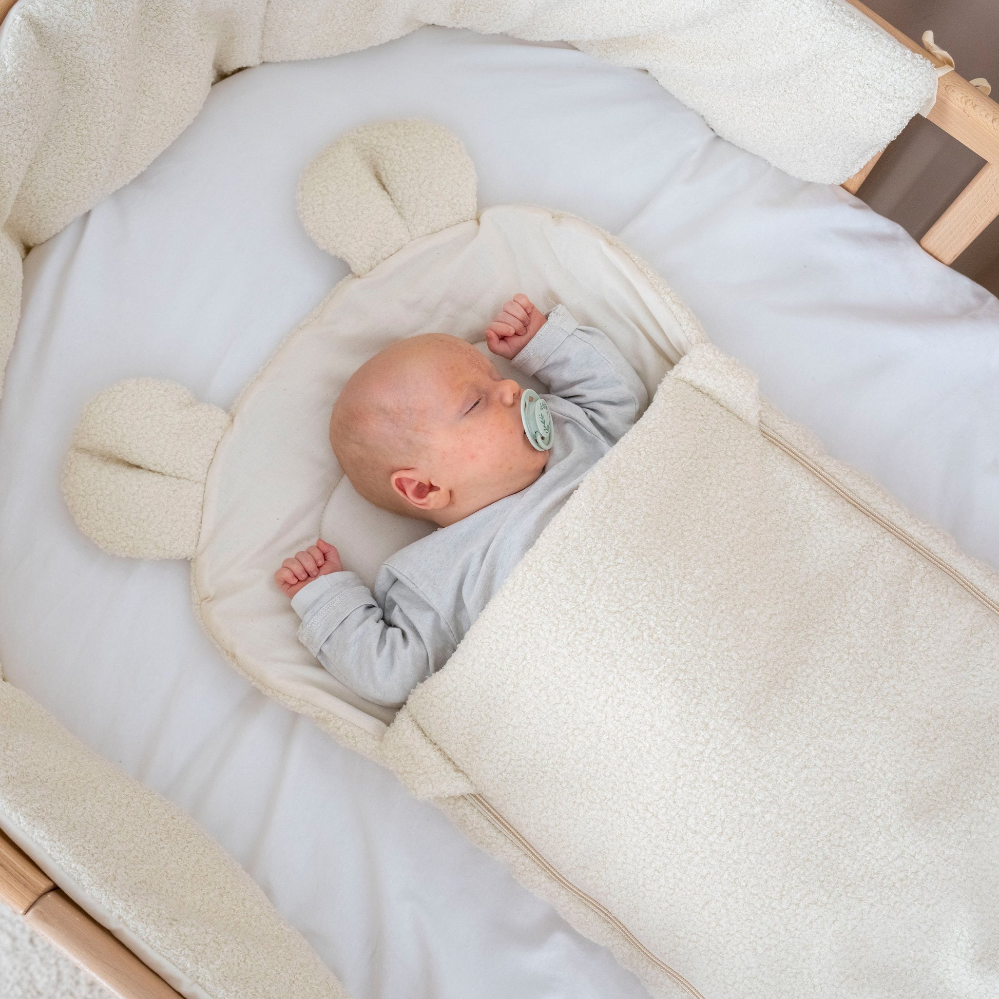 Kombiniere den Teddybär-Babyschlafsack mit unseren passenden Babydecken & Babynestchen aus Teddy-Bouclé – für eine harmonische, kuschelige Schlafumgebung.