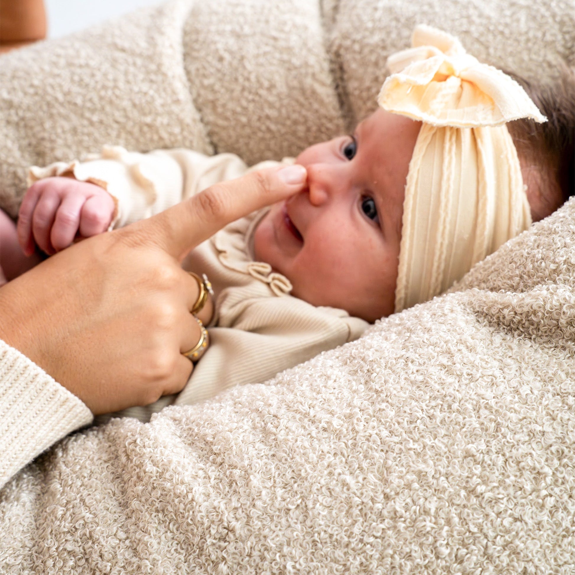 Unser Still- und Schwangerschaftskissen aus Bouclé Teddy ist ein vielseitiges 2-in-1 Seitenschläferkissen und Stillkissen, das dich in jeder Phase begleitet – von der Schwangerschaft über die Stillzeit bis weit darüber hinaus.