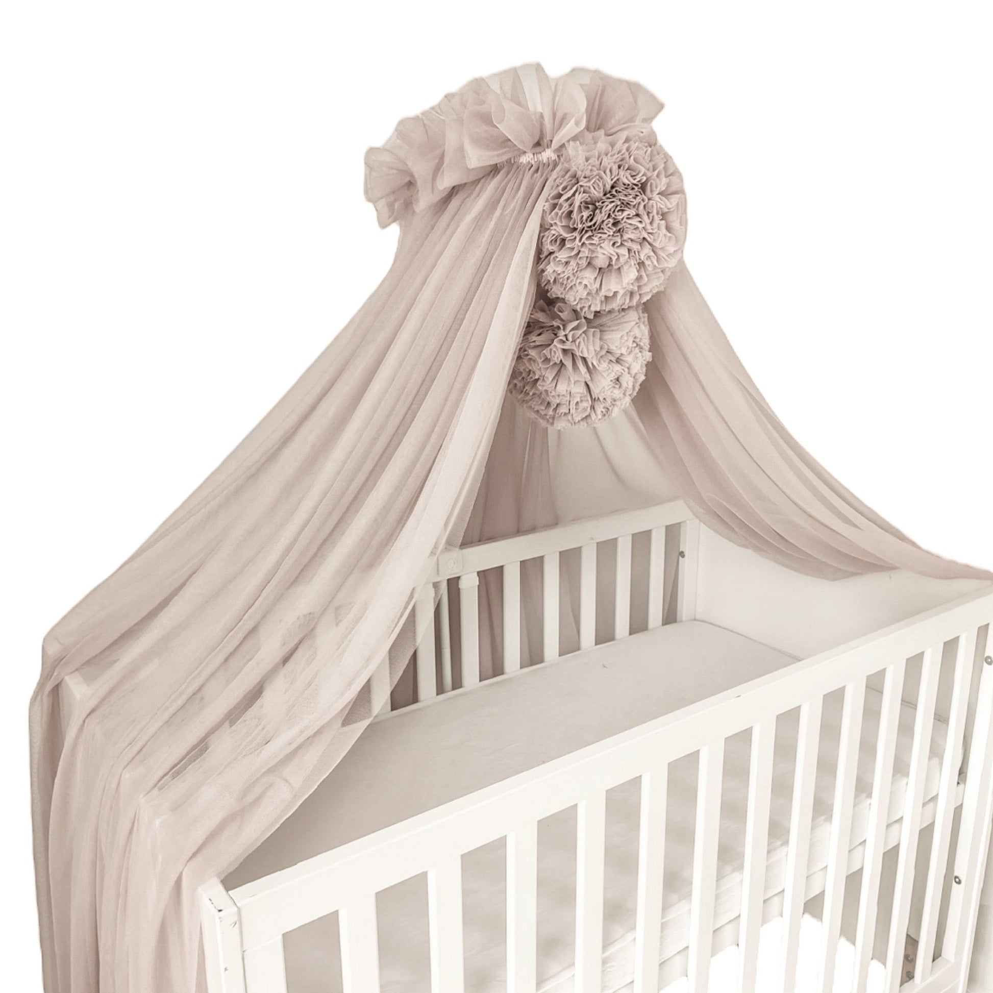 Schaffen Sie einen zauberhaften Schlafplatz für Ihr Baby mit diesem wunderschönen Tüll Betthimmel inkl. 2 großen Pompons. Der feine, weiche Tüllstoff sorgt für eine luftige und elegante Optik, während die liebevollen Details das Baby- oder Kinderbett in eine kuschelige Wohlfühloase verwandeln.