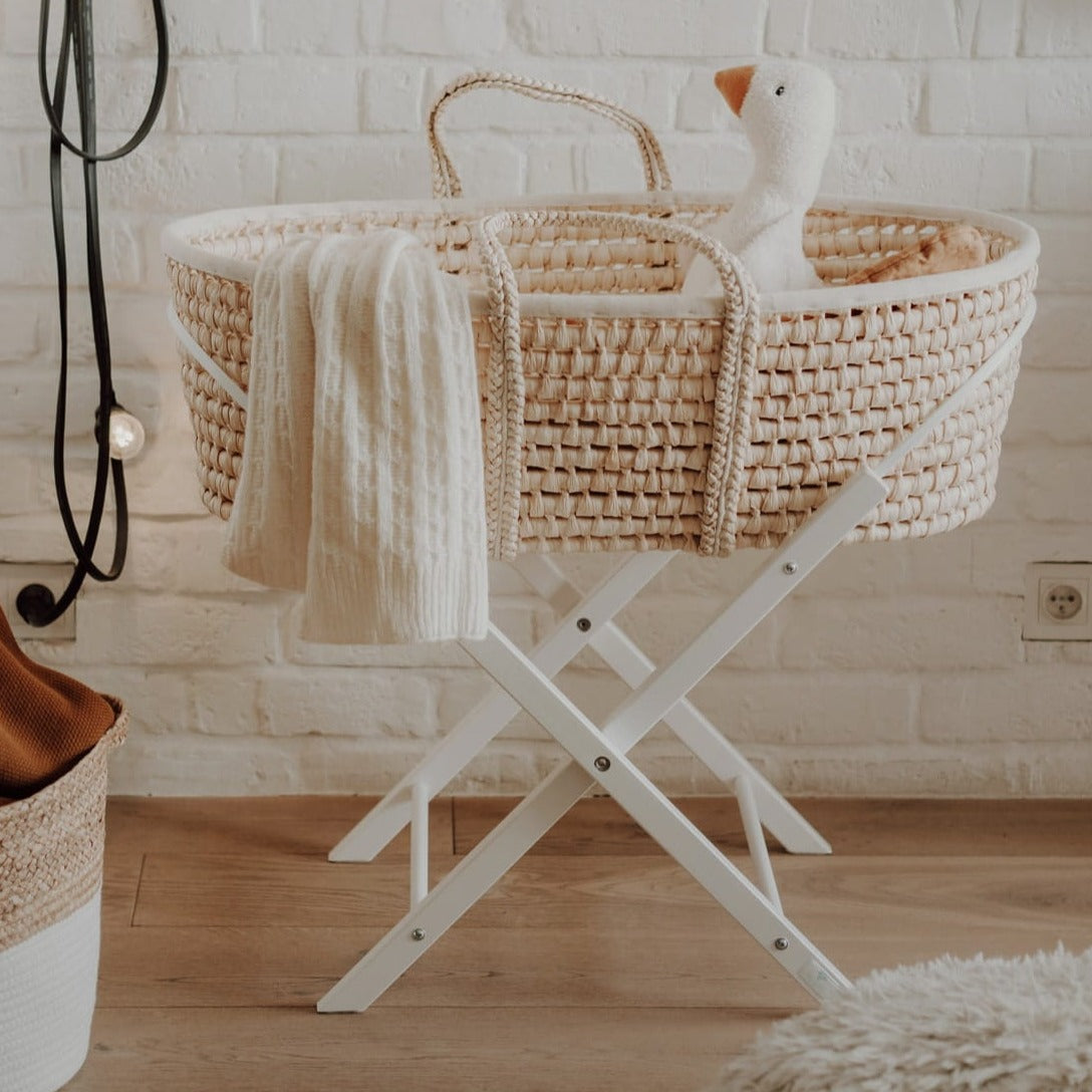 Der klappbare Holzständer von District for Kids ist die ideale Ergänzung zu deinem Moseskorb. Gefertigt aus massivem Buchenholz, überzeugt er durch Stabilität, hochwertige Verarbeitung und ein zeitloses Design. In Natur oder elegantem Weiß lackiert fügt er sich harmonisch in jedes Wohn- und Kinderzimmer ein und sorgt dafür, dass dein Baby immer auf einer angenehmen Höhe sicher gebettet ist.
